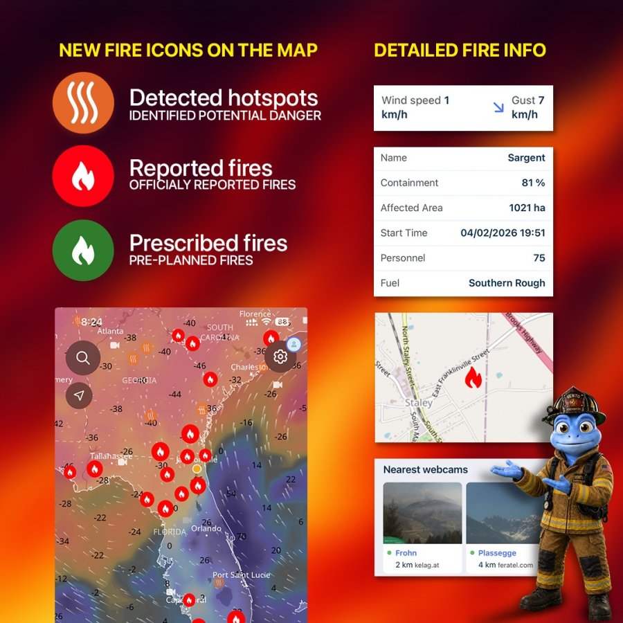 The Ventusky app introduces a new global fire-monitoring layer that combines satellite detected hotspots with officially reported fires from firefighting agencies. Users can now track fire activity worldwide in near real-time directly on the map.