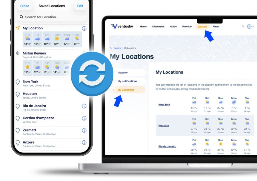 The third big update is synchronization across devices. After signing in, both your saved places and your weather notifications are automatically synced with your account. That means you can set everything up on one device and have it ready on another, whether you switch between phone and laptop or use both regularly. You'll find the places and notifications here: https://my.ventusky.com/weather/
